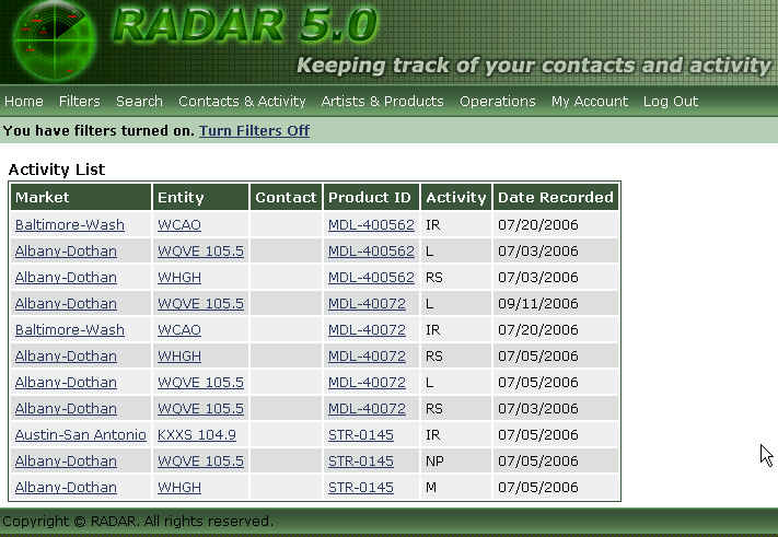 Dynamic industry contact management, project promotion, activity and tracking tool.RADAR 5.0 - The online version is now available!Create demand for your project with the ability to organize your contacts and build lasting relationships. The ability to manage relationships is the key to success! | RADAR FEATURES
